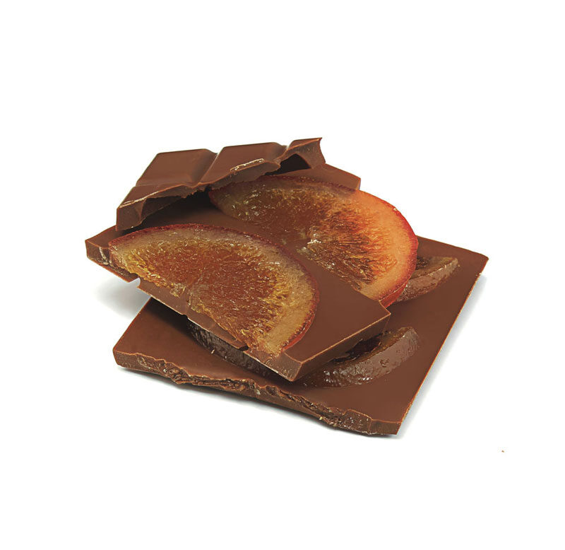 Tablette de chocolat au lait 35,8% de cacao, agrémenté de savoureuses demi tranches d’oranges confites.