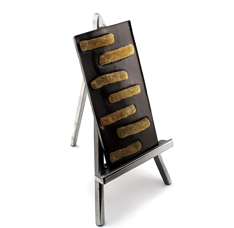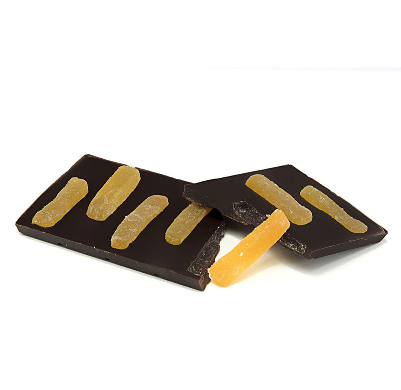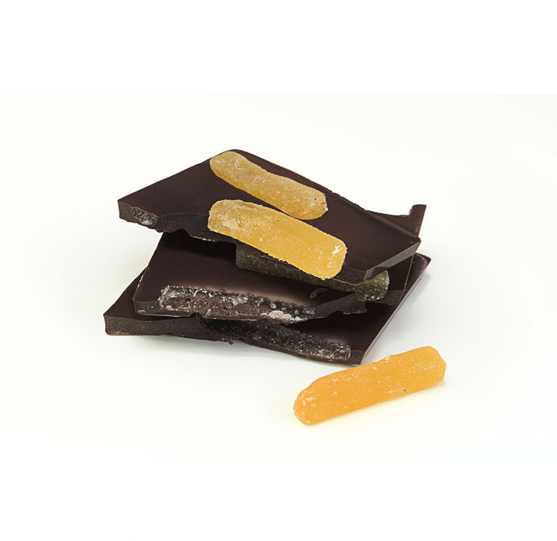Tablette de chocolat noir à 65%, garnie de délicieux bâtonnets de gingembre confit.